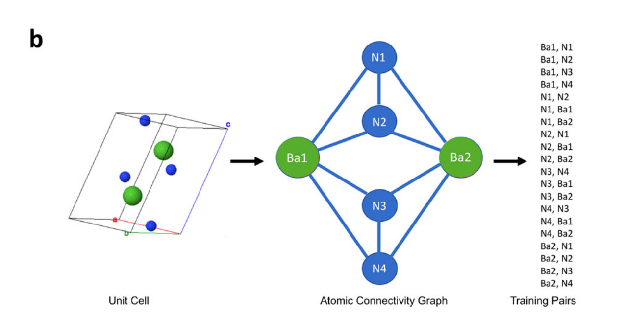 First, compounds are downloaded. Then, the Voronoi Decomposition is used to derive graphs from unit-cells, and from the graphs generate training-pairs. As they show in the paper: