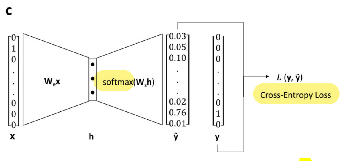 (...) single hidden layer with linear activation, whose size depended on the desired dimensionality of the learned embeddings, and an output layer with 86 neurons (one for each of the utilized atom types) with softmax activation. (...) minimizing the cross-entropy loss between the predicted context atom probabilities and the one-hot vector representing the context atom, given the one-vector representing the target atom as input.